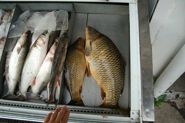 Unloading the catch early in the morning at dockside. The bin on the right contained a barbel.