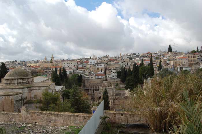 The Pool of Bethesda ruins are to the right of the basilica dome. The hill of Bethzatha may be seen rising in the background and ascending to the right.