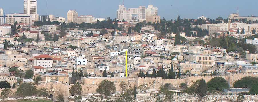 A view of the hill of Bethzatha from St. Steven's Gate in the lower left ascending to the NW. The yellow line indicates the location of the Bethesda pools