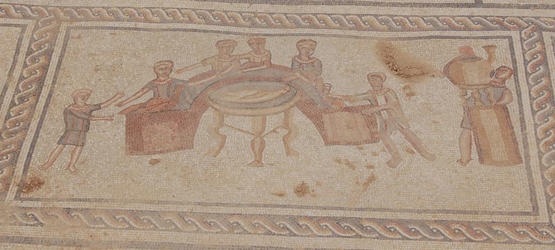Photo of a floor mosaic at Sephoris, Israel showing a triclinium.