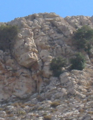 I bought a yellow 20 meter clothesline at a grocery store and then went to the summit. I tied a plastic Coke bottle filled with sand to the end of the line and dropped it over the edge. At about 50 feet it stopped. I pulled it up and dropped it and it went down until the entire 65 feet of the line was out and the line slack was gone. I went down to view the line and found it was dropped into a crevice down the cliff face, I was unable to retrieve it from the crevice as the bottle was wedged into the crack and it was anchored there permanently. This mountain has a large cave in it near its base. Another line colored blue was dropped the next day slightly to the left of the first location and there it was about 52 feet (20 meters = 65.62 feet) to the base of the vertical drop. This was done with a blue clothesline that blended in with the limestone cliffs in the early morning. There was another cliff that seemed steeper on the same mountain, but I was not able to measure it due to lack of time.