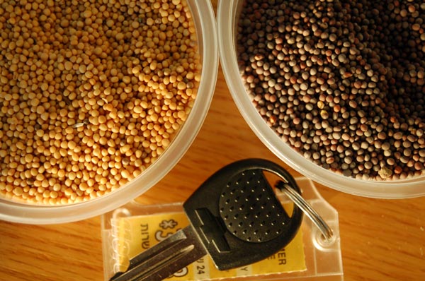 I purchased these mustard seeds in a gift shop near Lake Tiberias. There were white, yellow, shades of brown, reddish-brown, and black seeds. Yellow mustard produced a yellow mustard seed, while black mustard plants produced brown or black seeds.