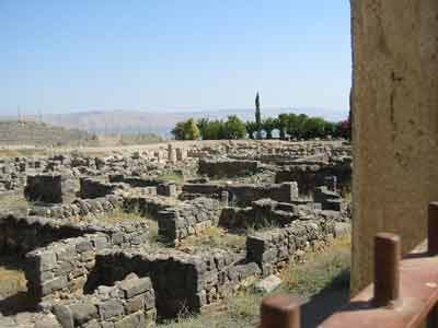A view from the white synagogue at Capernaum towards the lake. These are the ruins from the first few centuries AD. The houses were built of basalt igneous stone same as at the Talmudic era village discussed above.