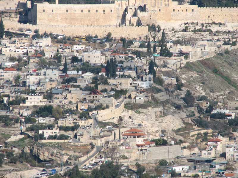 The Lower City of Roman era Jerusalem was between the Kidron Valley on the right, the Pool of Siloam at the bottom left corner, and the Turkish walls at the top of the photo. The current walls of Jerusalem were built more than 400 years ago, although the base of one of Herod's towers remains on the south side of the Jaffa Gate ("Tower of David" area).